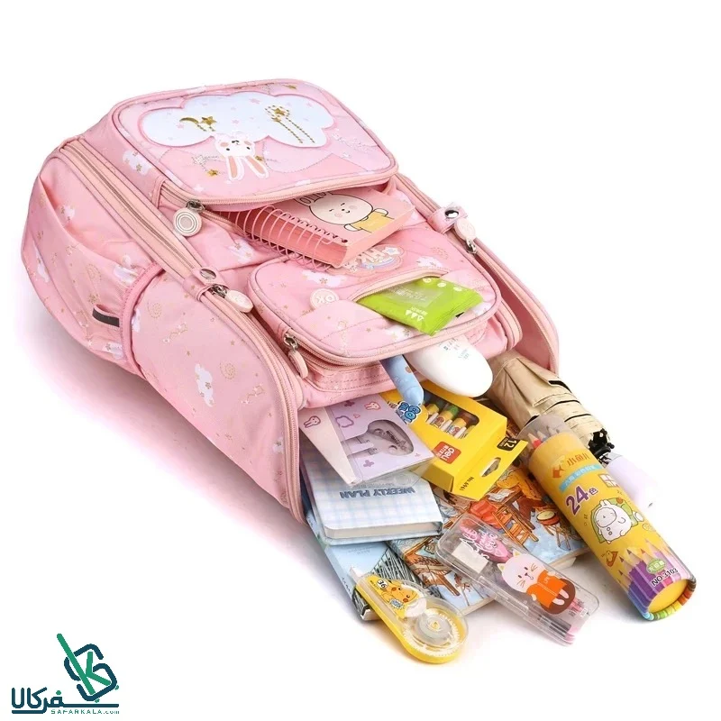 وجود جیبهای متعدد، از جمله سه جیب در بخش جلویی و دو جیب جانبی برای قمقمه یا بطری آب، نظمدهی به لوازم تحریر و وسایل شخصی را تسهیل میکند. همچنین کف کوله پشتی مدل خرگوش ابری برای جلوگیری از سایش، به پینهای محافظ پلاستیکی مجهز شده است.