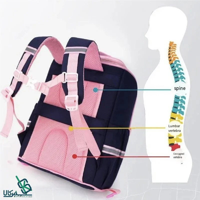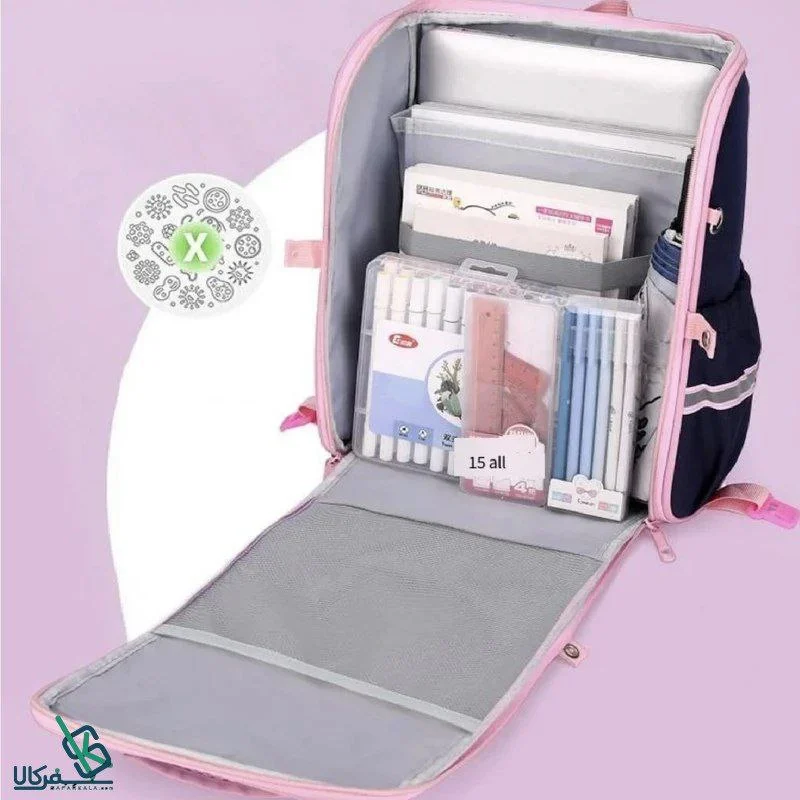 در بخش داخلی، یک محفظهی اصلی طبقهبندیشده برای نگهداری منظم کتابها و لوازم مدرسه تعبیه شده است. همچنین، یک جیب بزرگ در قسمت جلو و دو جیب جانبی برای قمقمه یا بطری آب، فضای کافی برای سایر ملزومات روزانه کودک فراهم مینماید. بندهای قابل تنظیم با پد ضد تعریق نیز راحتی بیشتری را هنگام استفاده بر روی شانه فراهم میکنند.